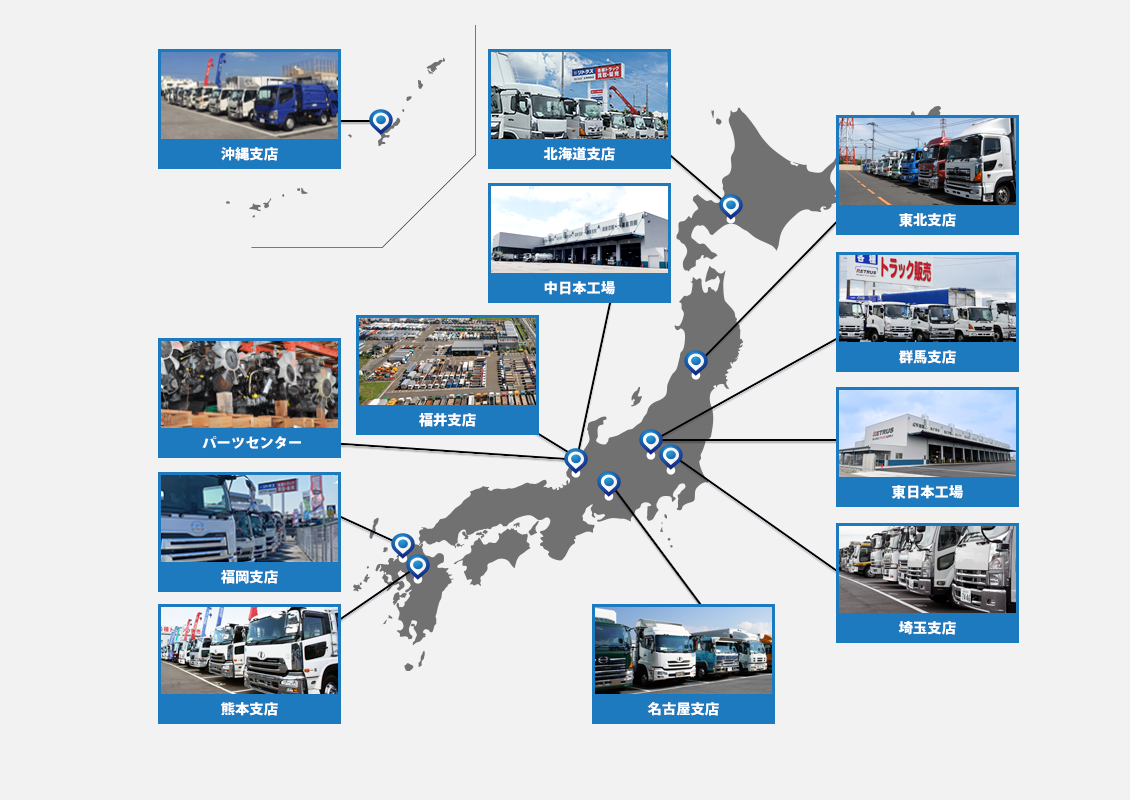グループとして全国展開を目的に設立。沖縄支店含む、グループ全国9拠点で中古トラックの販売やパーツ販売、リビルトパーツを手掛けており、