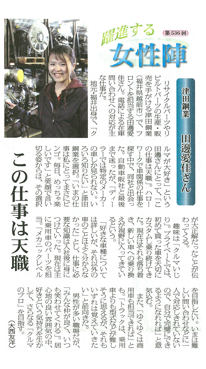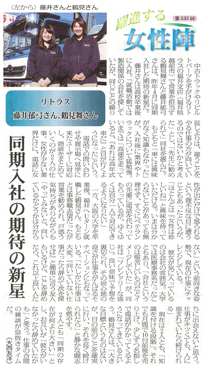 物流、運送、トラック、倉庫、ロジスティクスの専門新聞「物流ウィークリー」に、弊社の女性社員の活躍が記事として掲載されました。