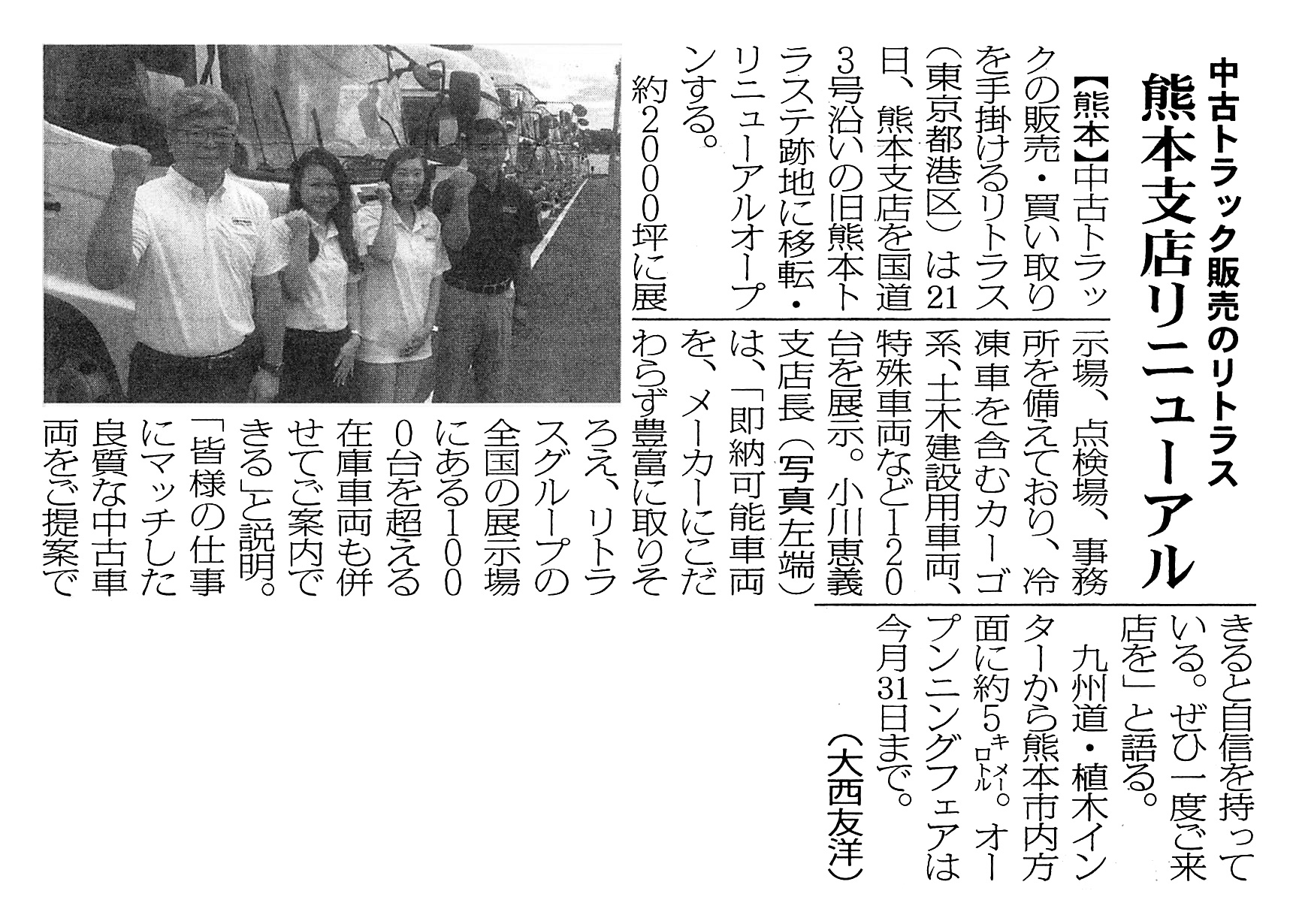 2018年8月21日(火) メディア掲載 インフォメーショントップ 熊本支店リニューアルが「物流ウィークリー」の記事に掲載されました。 物流、運送、トラック、倉庫、ロジスティクスの専門新聞「物流ウィークリー」に、熊本支店リニューアルが記事として掲載されました。 PDFはこちらから 掲載サイトはこちら 2018年8月21日(火) メディア掲載 インフォメーショントップ